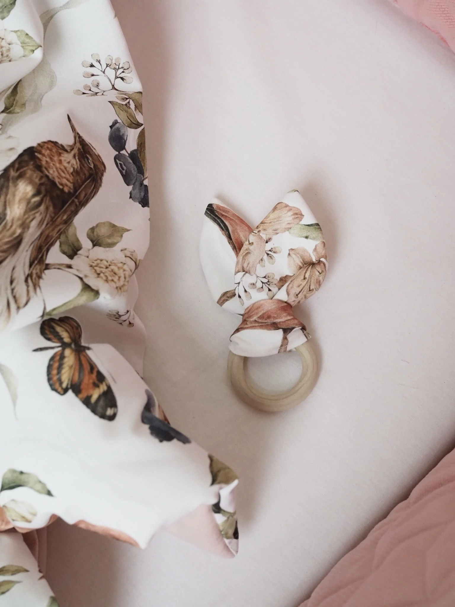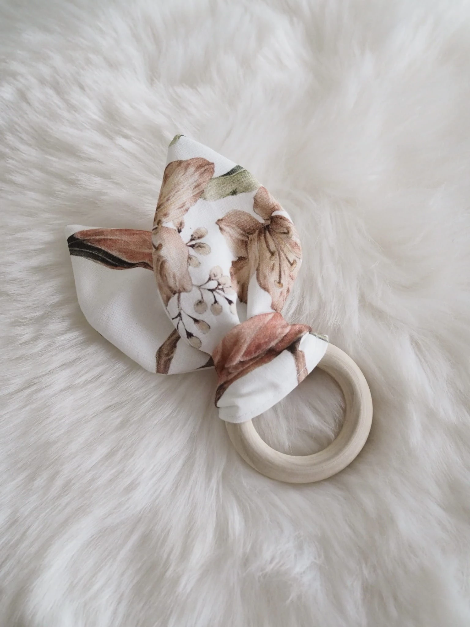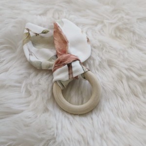 Gryzak wykonany z drewnianego, szlifowanego krążka oraz bawełnianej wstążki. Daje ukojenie maluszkowi podczas ząbkowania.