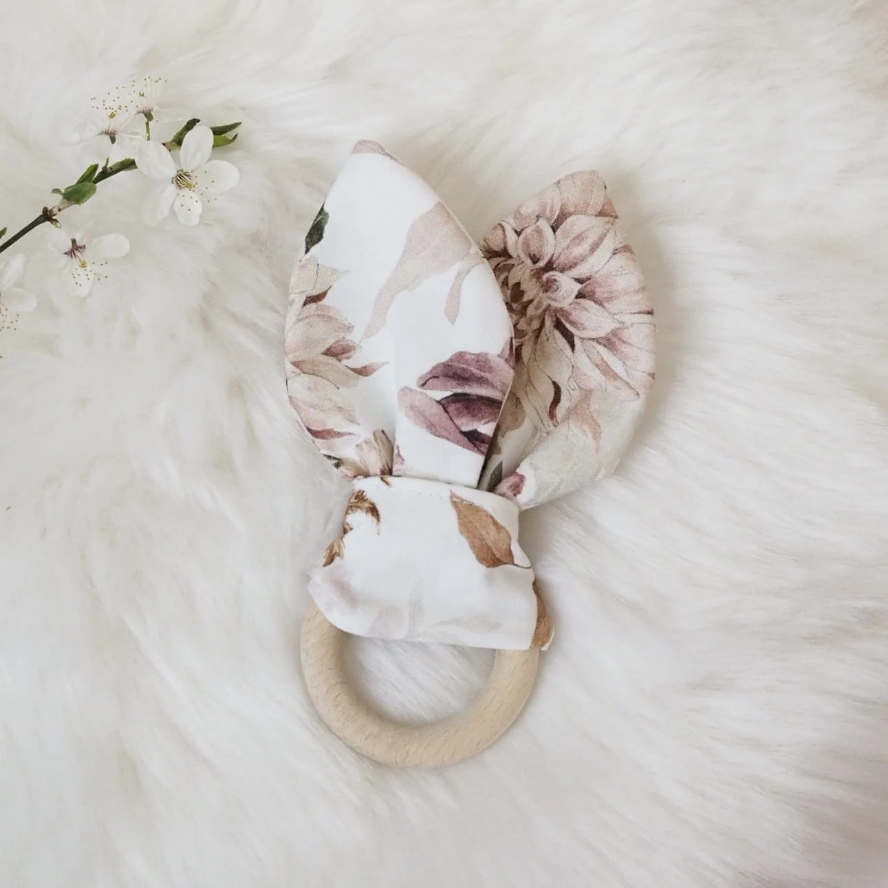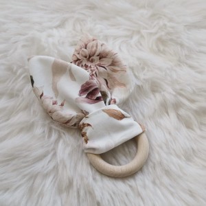 Gryzak wykonany z drewnianego, szlifowanego krążka oraz bawełnianej wstążki. Daje ukojenie maluszkowi podczas ząbkowania.