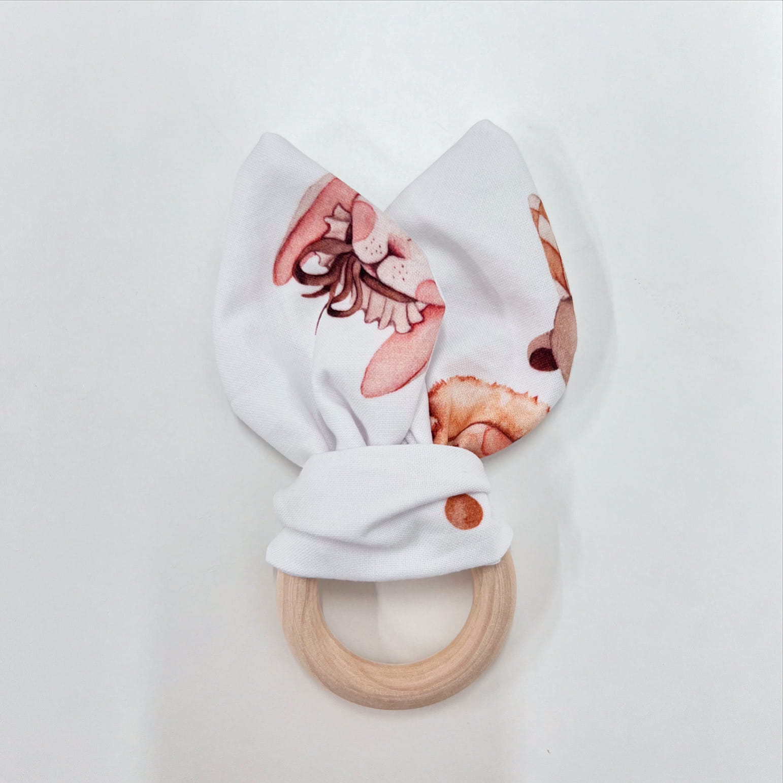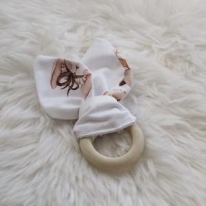 Gryzak wykonany z drewnianego, szlifowanego krążka oraz bawełnianej wstążki. Daje ukojenie maluszkowi podczas ząbkowania.