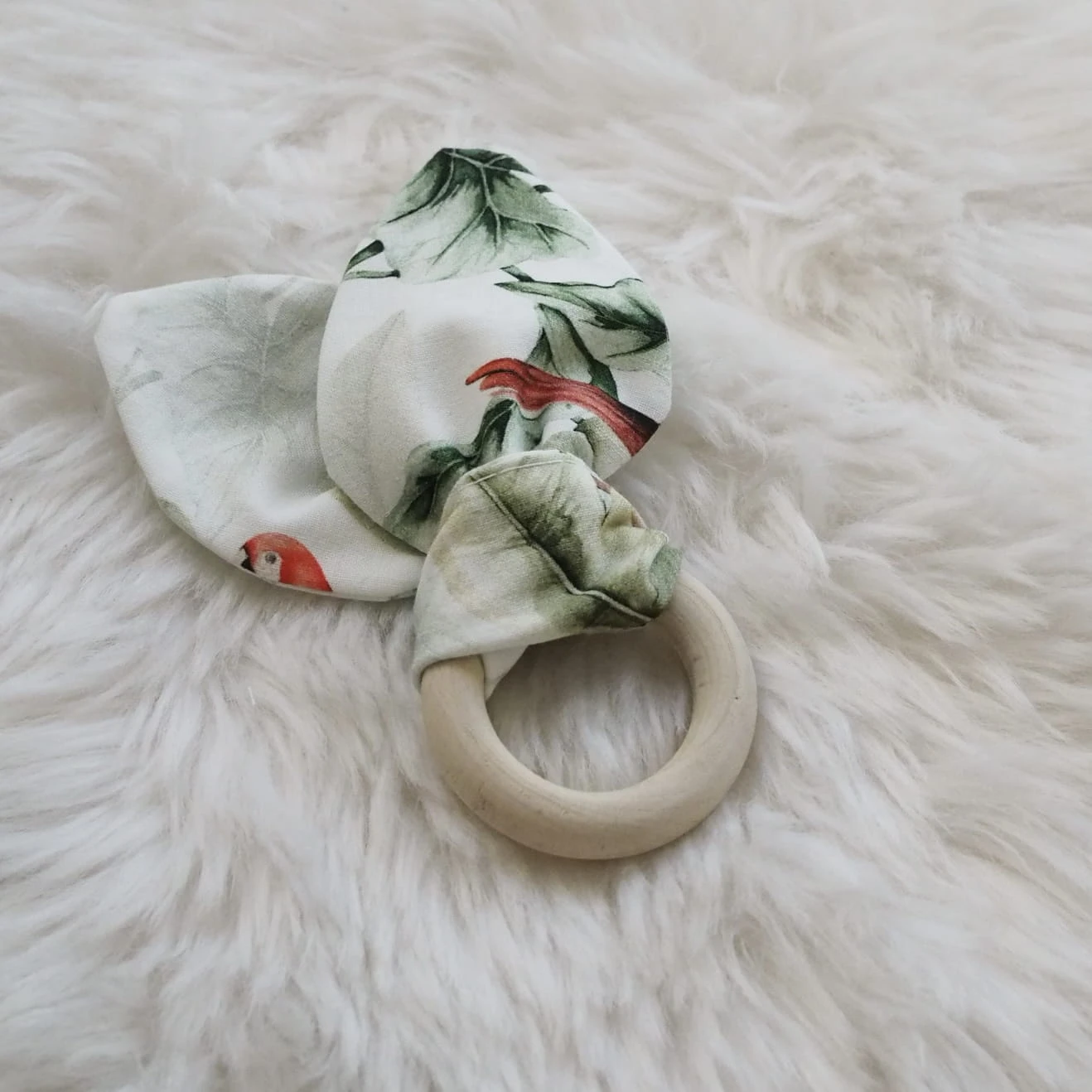Gryzak wykonany z drewnianego, szlifowanego krążka oraz bawełnianej wstążki. Daje ukojenie maluszkowi podczas ząbkowania.