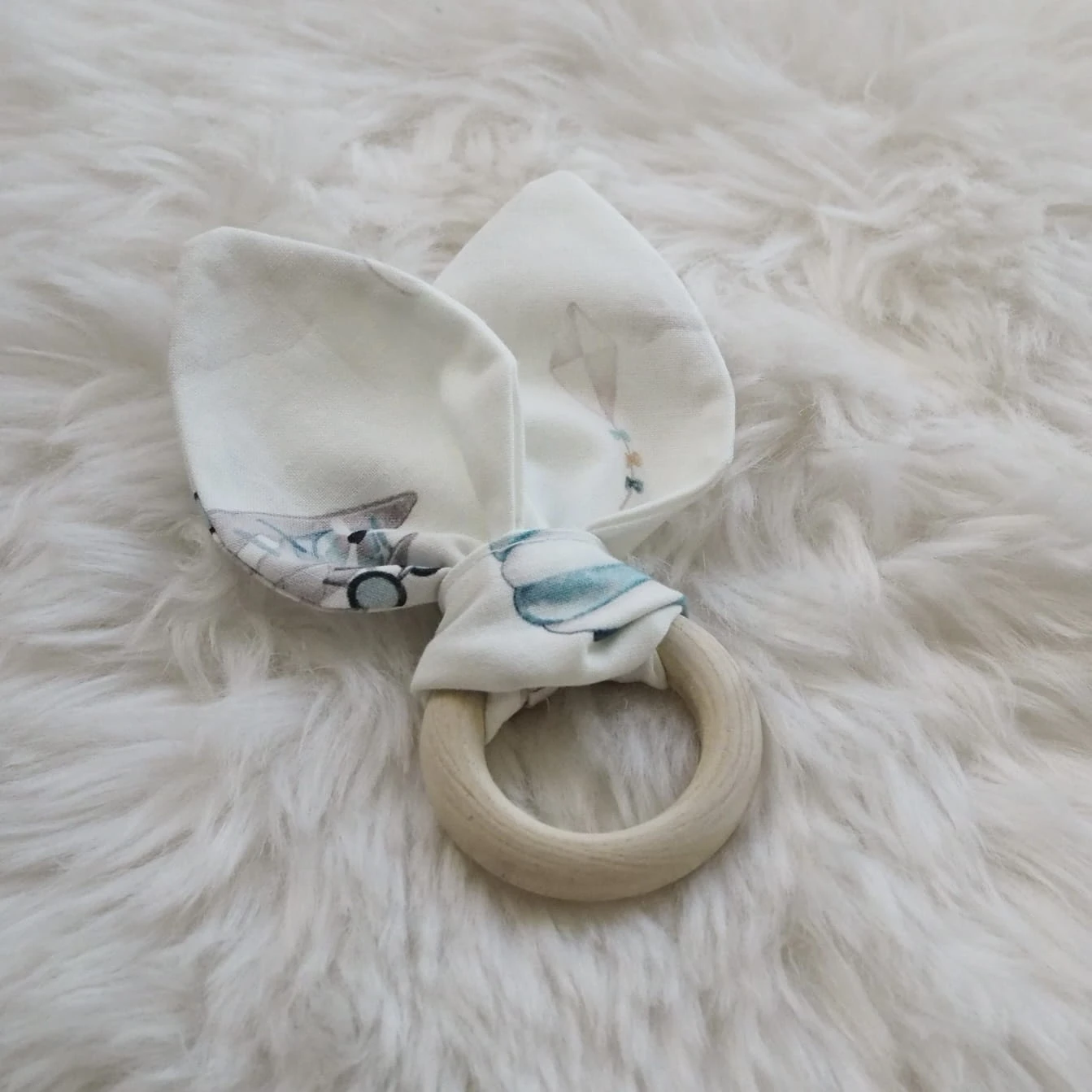 Gryzak wykonany z drewnianego, szlifowanego krążka oraz bawełnianej wstążki. Daje ukojenie maluszkowi podczas ząbkowania.