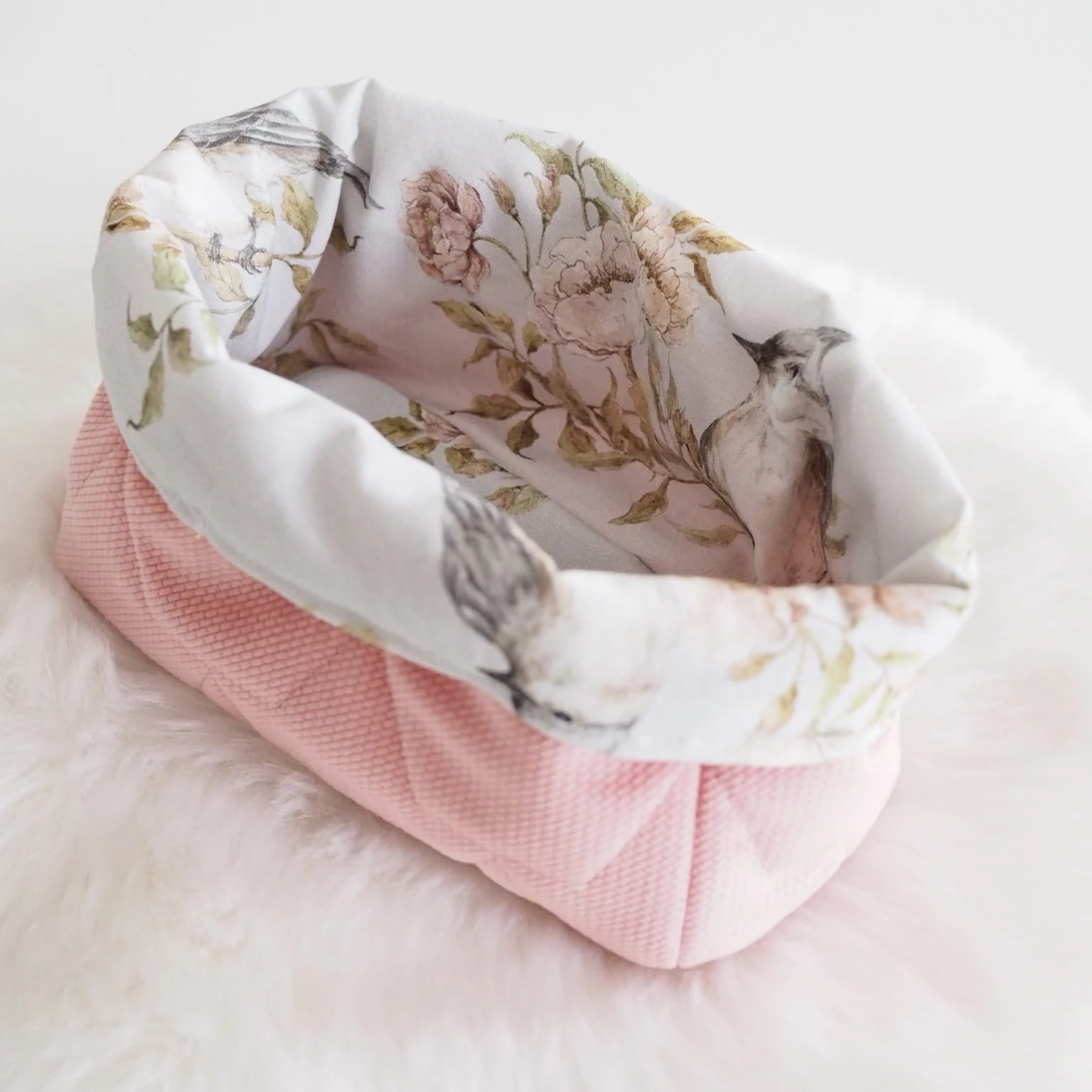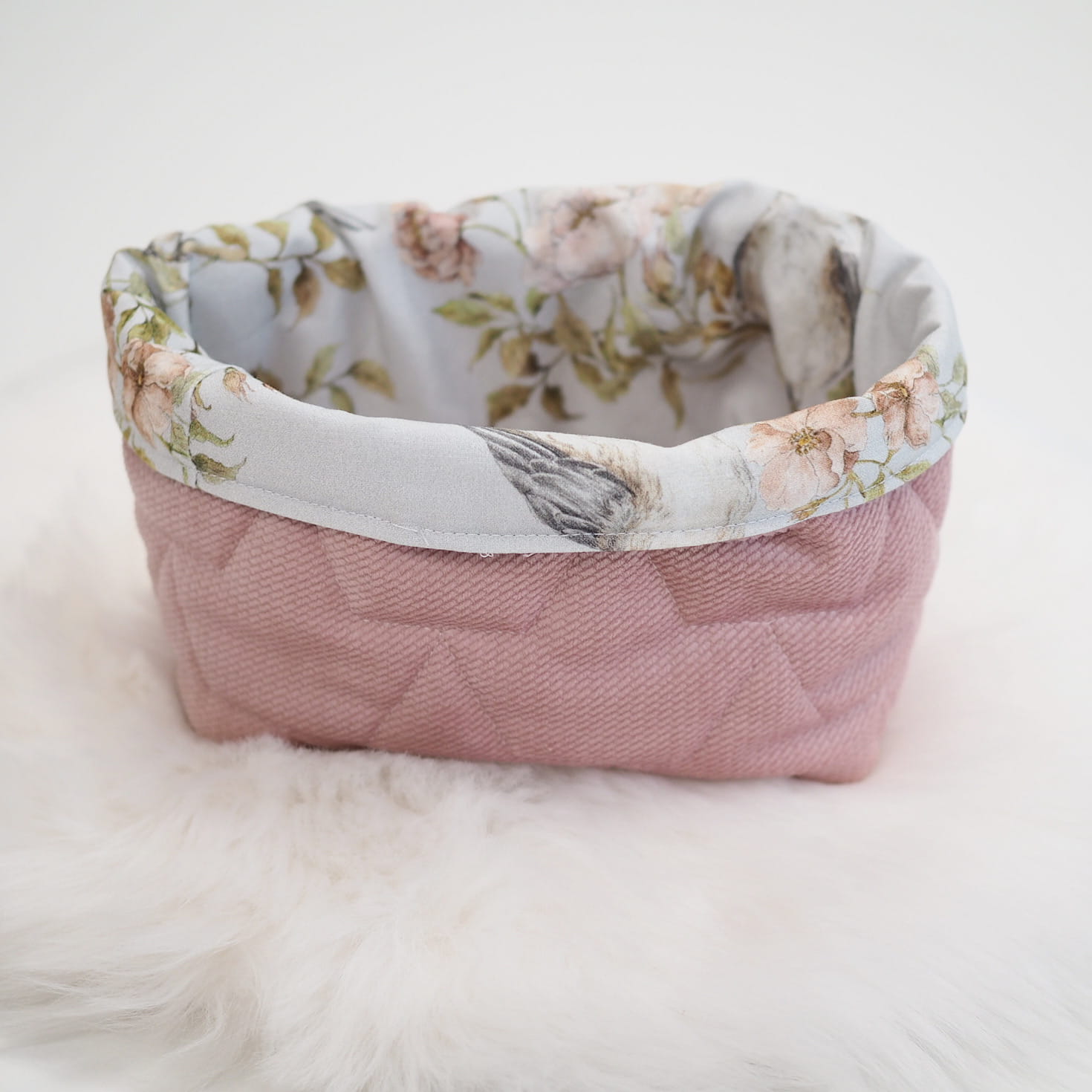 Będąc rodzicem niełatwo jest utrzymać ład i porządek. Oferujemy Państwu materiałowe koszyczki na wszystkie przydatne przybory. Można ich urzyć do przechowywania środków higieny po kąpaniu, pieluszek, smoczków czy skarpetek. Wykonane z bawełny premium oraz dzianiny velvet pasujących do pozostałych elementów wyprawki, którą możecie skompletować w naszym sklepie.