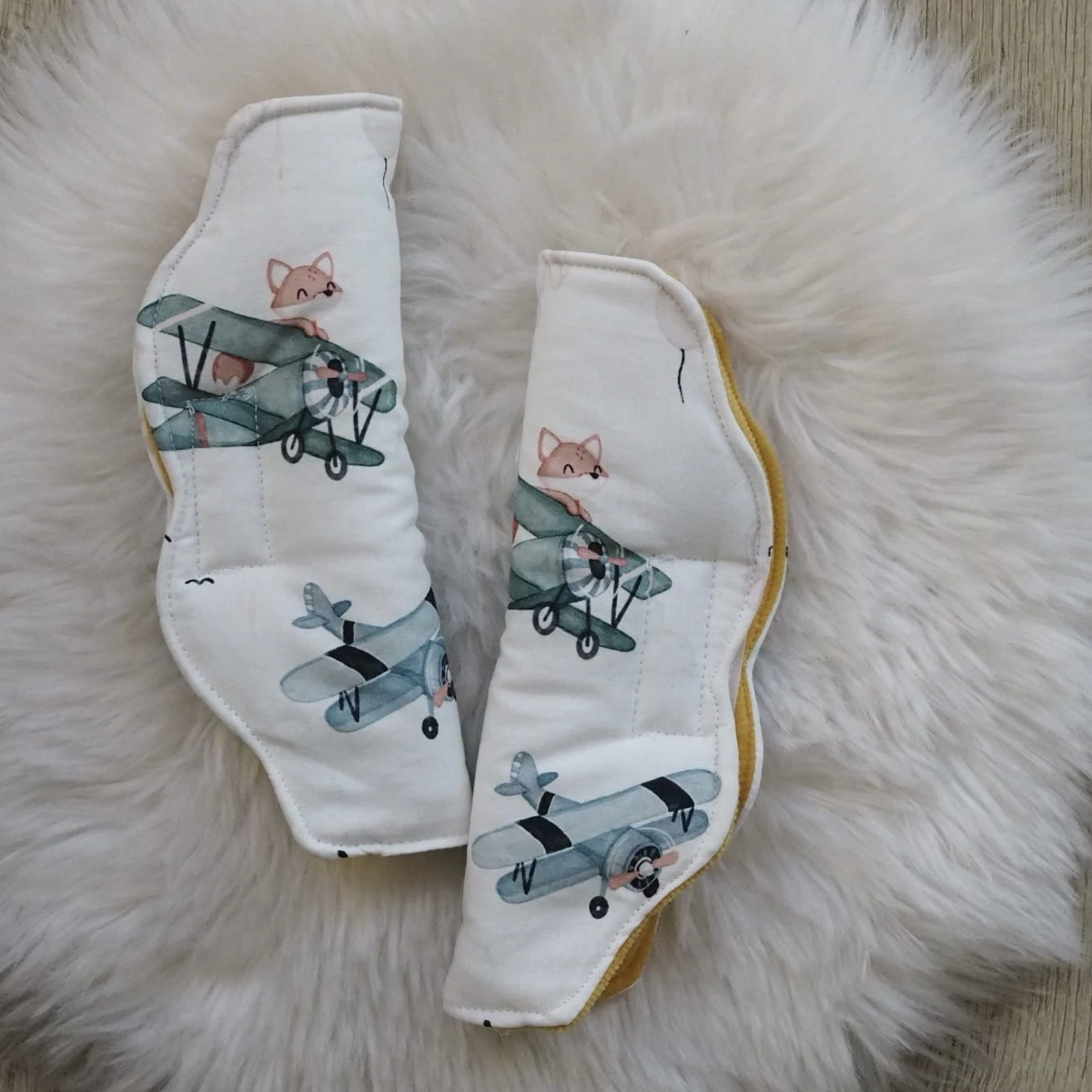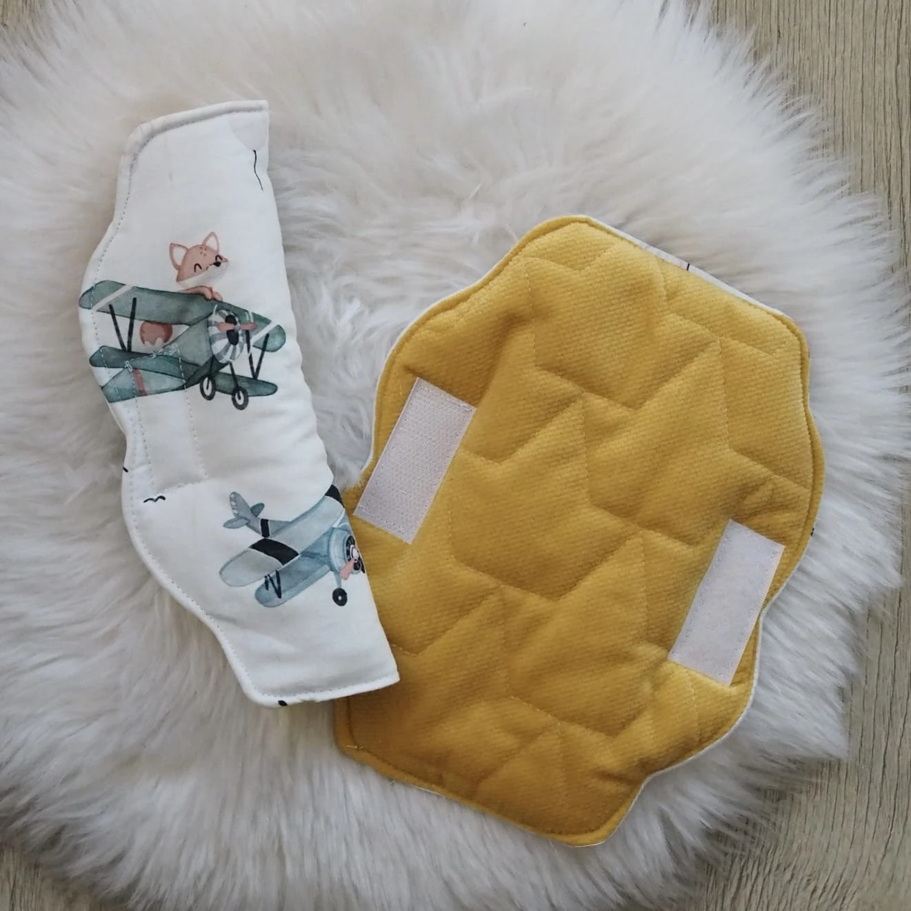 Aby każda podróż była przyjemnością. Osłonki na pasy wykonane z naszych pięknych wzorów. Jedna strona to bawełna premium, druga zaś, delikatna i przyjemna w dotyku dzianina velvet. Osłonki mają wyjątkowy kształt, który przypadnie do gustu małym odkrywcom. Mocowane są za pomocą rzepu. Z łatwością zamontujecie je w fotelikach i wózkach maluszków.